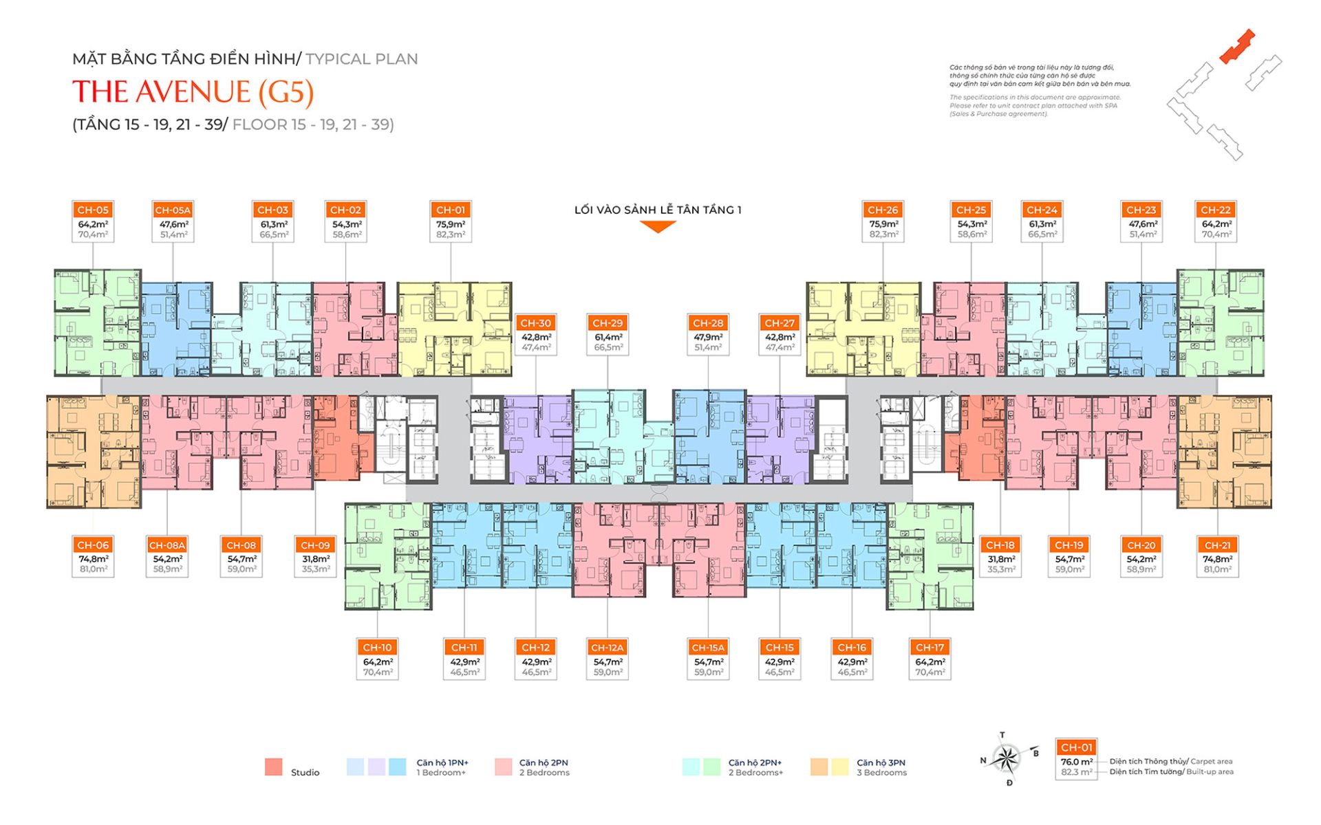 - Loại hình căn hộ: studio, 1PN+1, 2PN, 2PN+1, 3PN