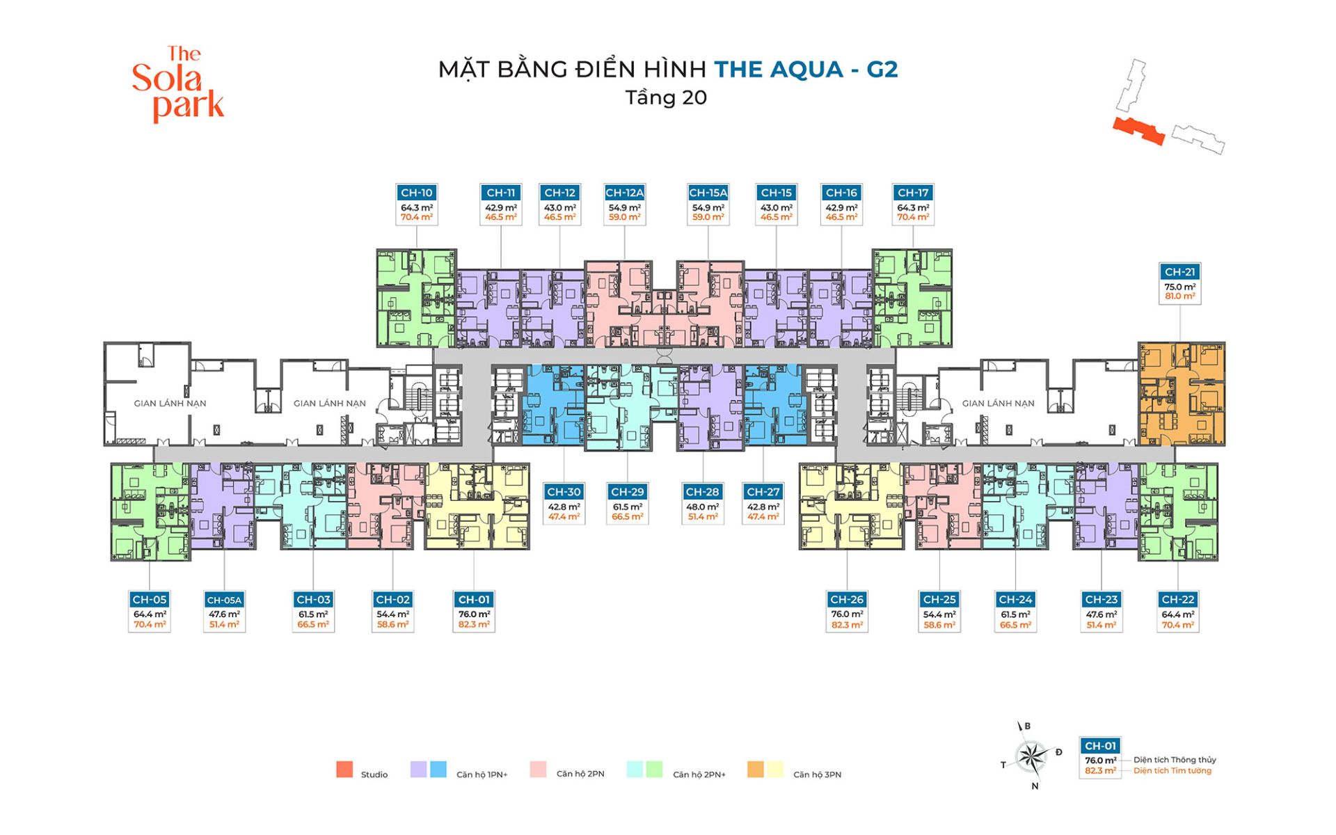 Các căn hộ G2 The Aqua có diện tích từ 31,9 – 75,4 m², với các loại hình: studio, 1PN+1, 2PN, 2PN+1, 3PN.